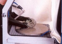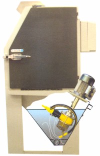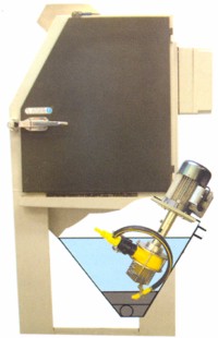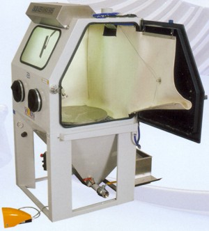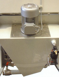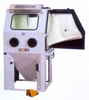 Az AQUBLAST berendezés nyitott ajtaján keresztül betöltünk kb. 20 kg-nyi szórószemcsét, majd folyadékot (a detergens vizes oldatát – kb 1% töménységben) juttatunk a készülék zsompjába, jelig töltve azt. A nedves szemcseszóró beren-dezésben egy speciálisan erre tervezett poliuretán szivattyú keveri össze a koptató közeget a tisztító folyadékkal, zagyot képezve, amit kb. 2 bar nyomáson juttat a szórópisztolyhoz, ahova préslevegőt is vezetünk, hogy felgyorsítsuk a zagyot és a tisztító hatást növeljük, ami kifejezetten kíméletes. |